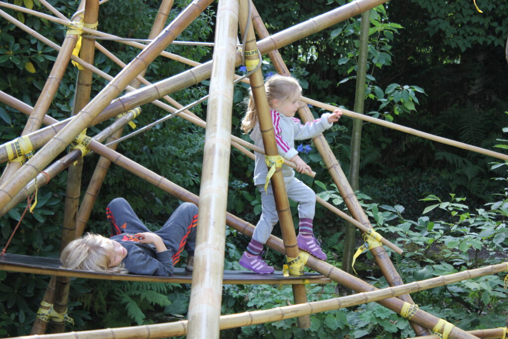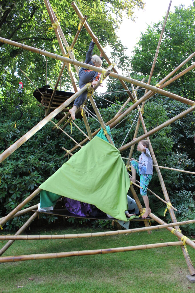 Dieses Klettergerüst versteht Bewegung als spielerische Auseinandersetzung mit Raum und Material. Bambus bietet dafür ideale Voraussetzungen: leicht, stabil und mit einem natürlichen Rhythmus, der das Klettern intuitiv macht. Das Projekt ist so konzipiert, dass es sowohl körperliche Aktivität als auch Neugier fördert – ohne künstliche Überinszenierung. Es geht nicht um Leistung, sondern um Erfahrung, Vertrauen und die Freude an Bewegung in einer klaren, natürlichen Struktur.